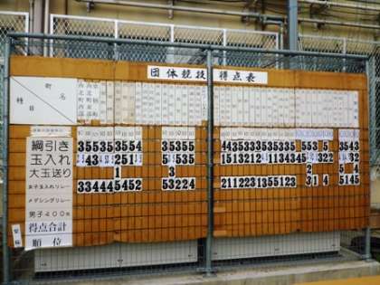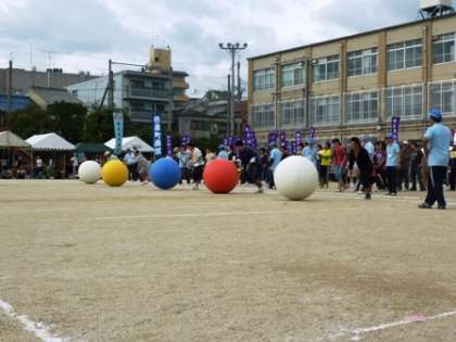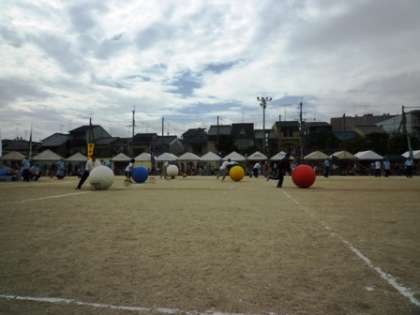 お昼休憩が終わって,午後の部が始まりました。午前中の町別対抗得点の最高は24点となっています。午後の最初の競技は,さっそく町別対抗競技の大玉送り競走です。各町の選手たちは,大玉をうまく運んでリレーをされています。