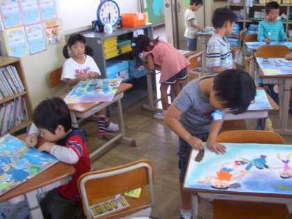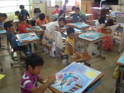 背景をコンテを伸ばして淡い色で仕上げた後,自由にいろいろなものを描き込んでいます。そろそろ仕上がりです。一人ひとりの個性が出て楽しい作品が仕上がっていきます。