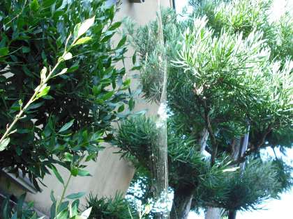 写真ではわかりにくいかもしれませんが,ジョロウグモが大きな巣(網)を作っています。中心から放射状にのびた「縦糸」と,同心円を描くように張られた「横糸」がきれいな形を作っています。今年は,秋口からクモの巣(網)が多く見られます。