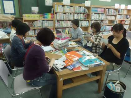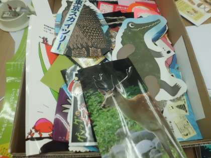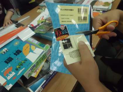 読書週間に向けた取組の一つとして,しおり作りをしてくださっています。読書週間の福引用です。図書室の本はブックカバーを貼りますので,もともと本についているカバーは不要になります。カバー葉楽しい絵がいっぱいあります。そこで,それを利用して,しおりを作ります。読書週間が楽しみですね。図書ボランティアのみなさん,ありがとうございます。