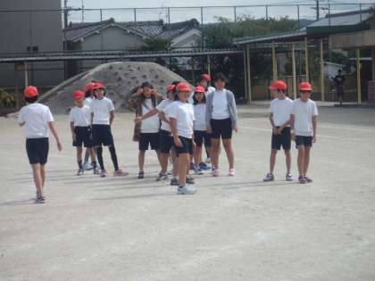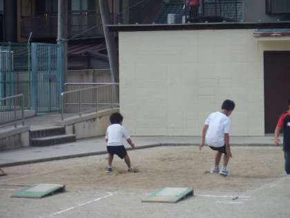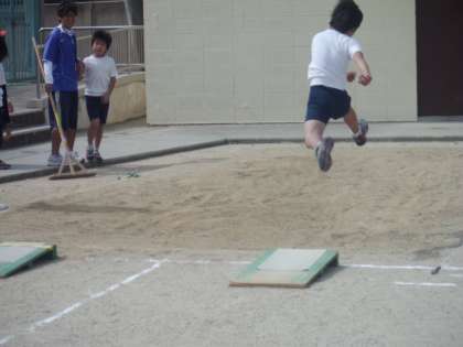 助走や踏切,空中動作などを工夫し,自分の記録に挑戦しています。まずは踏切番を用いて,体を高く浮かせて跳ぶイメージ,素早く強く踏み切るイメージをつかんでいきます。