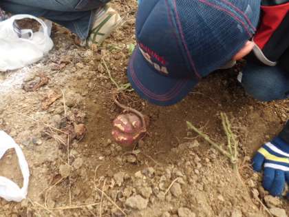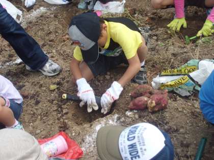 畑でさっそくいもほりです。一人二株ですが,土が硬く,なかなか掘れません。それでも,おいもを傷つけないようにていねいに掘っています。おおきなおいもがたくさん採れました。収穫したおいもの重さ比べ大会がありおおきなおいもでは890グラムもありました。