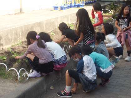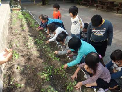種を植えたダイコンから,たくさんの芽が出てきました。そこで,大きなダイコンを作るために間引きをしています。