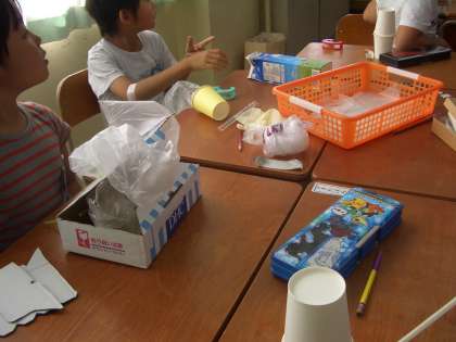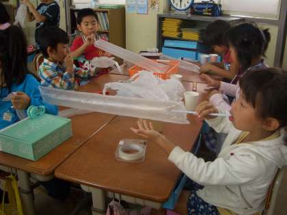 いろいろな形のビニル袋をストローとつなげ,ストローで息を吹き込むと箱から飛び出す仕組みのおもちゃを作っています。工夫するといろんな飛び出すものができます。出来上がりが楽しみです。