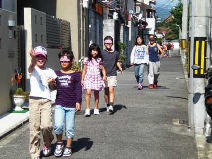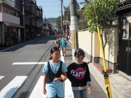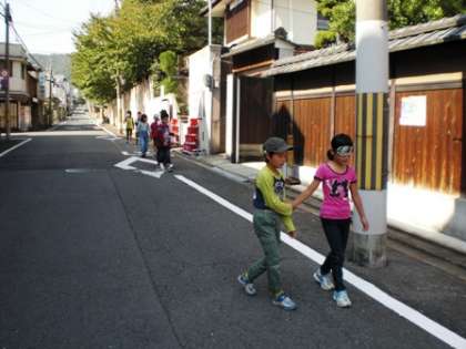 3年生では総合的な学習の時間に,目の不自由な人の立場について考える学習を進めています。今日は,学校の周りをアイマスクをつけて歩く体験をしました。学校の中と違って,段差もあるし自転車や車も通るので,安全に歩けるようにとても緊張しました。