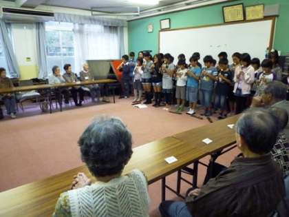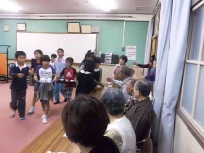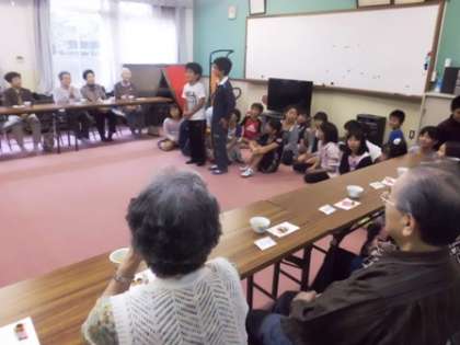 今日は,3組の子どもたちが,すこやか学級に参加しました。リコーダー演奏と歌をきいてもらったあと,お茶だしのサービスをしました。