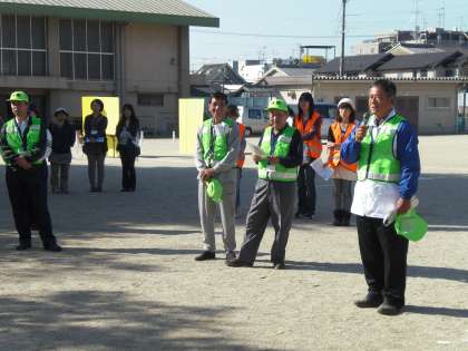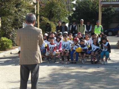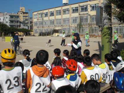 快晴の下,セイフティーチャリコンテストが行われています。開会式では,藤原会長・上校長・北警察署の警察官の方々からお言葉をいただきました。