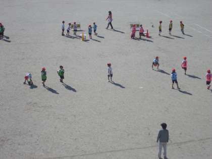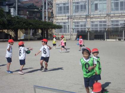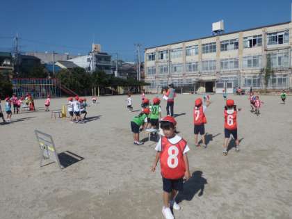 昨日の雨と打って変わって,今日は青空が美しい秋晴れ。運動場では1年生がパスゲームを楽しんでいます。