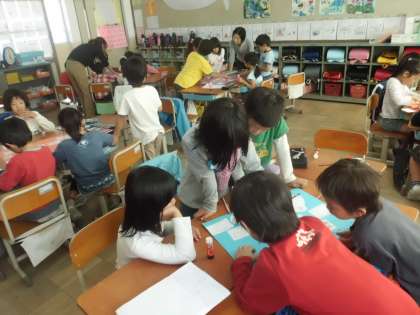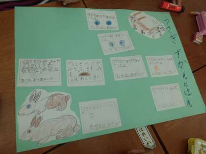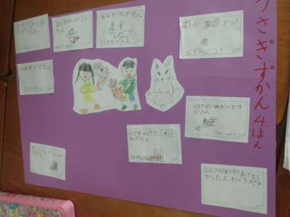 学校で飼育しているウサギの体や毛のようすやえさの食べ方,においなどよく観察して,うさぎずかんを作っています。,ウサギの特徴をよくみています。