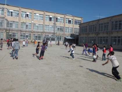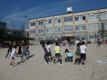 運動委員会主催のドッジボール大会,今日は5年生です。5年生は各学級2チーム,男女混合で行っています。時間が少ないのでリーグ戦はできませんが,みんな助け合って楽しんでいます。