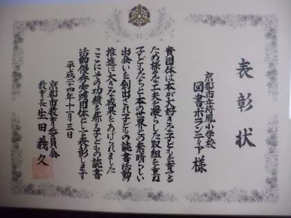 待鳳小学校の図書ボランティアの皆さんの多くの取組に対して,平成24年度 京都市子どもの読書活動優秀実践団体表彰 教育長表彰をいただきました。図書ボランティアの皆さん,おめでとうございます。これからも,より一層,子どもたちの読書活動が活性化いたしますように,ご協力をお願い申し上げます。