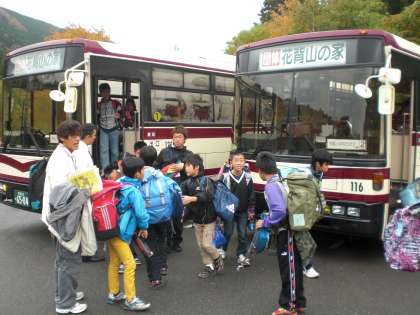 山の家に到着しました。さあこれから野外活動の始まりです。みんなとっても元気です。入所時の気温は14.6度,普段より暖かいそうです。