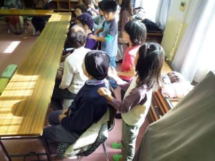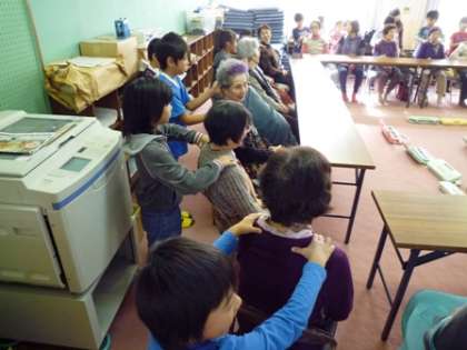 今日は,2組の子ども達がすこやか学級の方々と交流しました。お年寄りの方々も良く知っておられる「夕焼け小焼け」の歌を一緒に歌ったり,子ども達の後に続いて「やまびこさん」の歌を歌ってもらったりしました。その後,肩たたきや肩もみをしながらいろいろなお話をして,楽しいひと時を過ごしました。