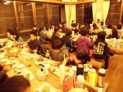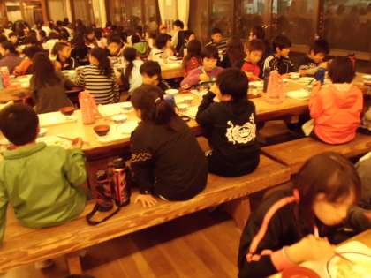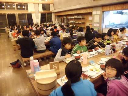 先ほど紹介した夕食,今日は交流の森で一緒に活動した3校のグループの友だちと仲良く,話をしながらおいしくいただいています。子どもたちって,すぐに仲良くなるものですね。この後は天体観測です。今日は素敵な星空が見えると思います。