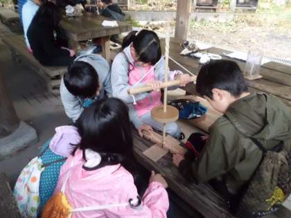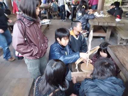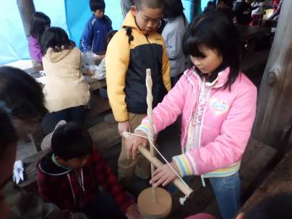 今日は午前9時から火お越し体験,起こした火を使っての焼きそば作りです。まずは,火お越しです。今はマッチやライターがありますが,昔の人の火お越しを体験します。初めて体験する子どもたちがほとんどで,火が本当におこせるのか心配です。