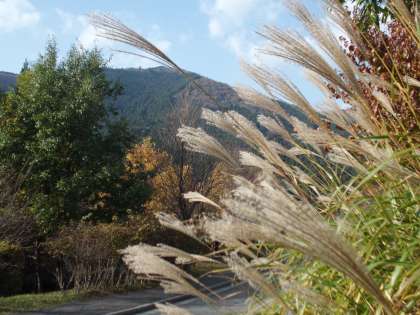 ちょっと一服。花背山の家の玄関のススキを道路を挟んで反対側の畑刈峠の紅葉を背景に写して見ました。暖かい1日で,花背の秋を満喫しています。