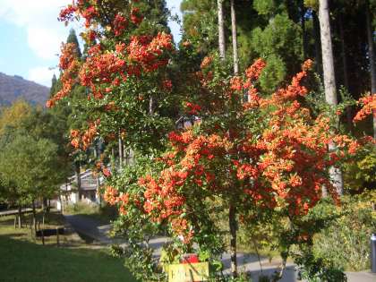 ちょっと一服。焼きそばを作った第1炊飯場へ行く途中にトキワサンザシの赤い実が見事に実っていました。春に白い花を咲かせ,秋に結実します。自然ってとても素敵ですね。残り2日ですが,子どもたちに,いっぱい自然を感じ取ってほしいと願っています。