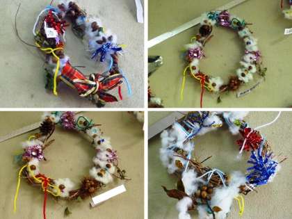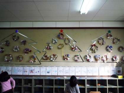 先日,船岡山で拾ってきたドングリや,春から育ててきたアサガオの弦などを使って,素敵なリースを作りました。みんなが作ったリースを教室に飾ると,楽しいクリスマスツリーができました。