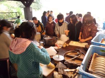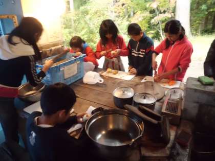 さあ,いよいよ野外炊事,カレー作りです。まずは材料をきっていきます。