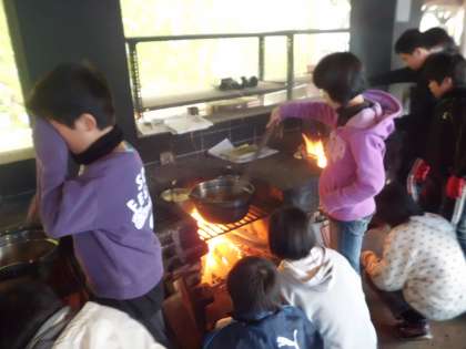 肉や野菜を炒め,カレー作りの始まりです。もちろん,ご飯も一緒に炊いています。