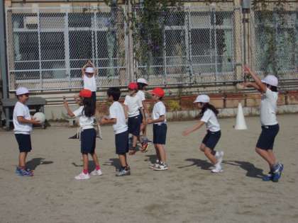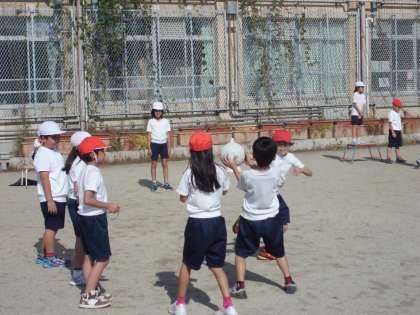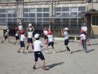 有利な場所への動きやパスを工夫し,相手チームと得点による勝敗を競い合って楽しみます。子どもたち,ボールを使ったゲームは大好きですね。