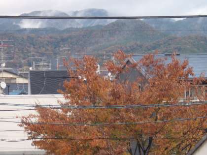 北山通のケヤキの向こうに見える山々の紅葉が進んでいます。