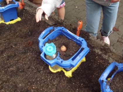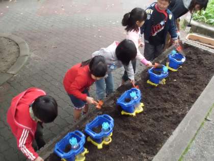 アサガオの終わった鉢に中リップの球根を植えました。色は赤・ピンク・白・黄・紫です。さて,何色の花が咲くでしょう。