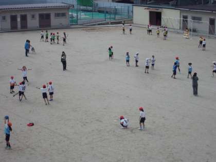 2年生は体育体育の時間にパスゲームをしています。そこで,今日はクラス対抗パスゲーム大会です。みんな,楽しそうにゲームをしています。