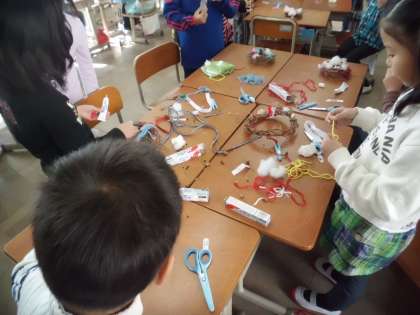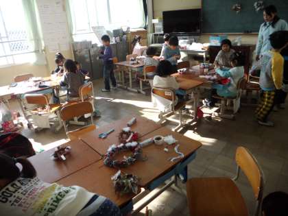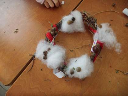 アサガオのつるを使ってリースを作っています。綿や毛糸を使い,船岡山で拾ってきたドングリなどをつけていき,素敵なリースが仕上げって来ています。