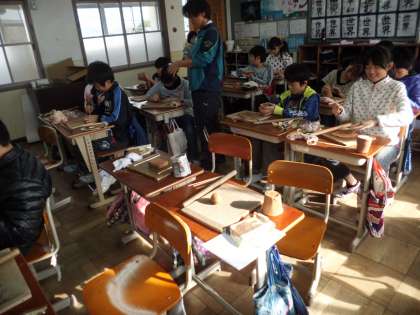 粘土を使って呼び鈴を作っています。紙コップをつかって形を整え,それに持つところや装飾を施していきます。どんな素敵な作品が出来上がるでしょう。