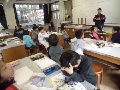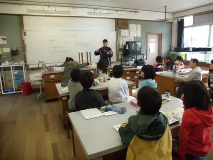 4年生では,これからものの温度と体積やもののあたたまり方の学習で理科室を使います。当然アルコールランプやガスコンロも使用します。今日は,実際に理科室に入って理科室にある器具や道具を使ってどんなことができるか話し合い,安全に観察や実験をするために,理科室で守るべき点について考えています。次の時間には実際にアルコールランプやガスコンロの使い方を学習します。