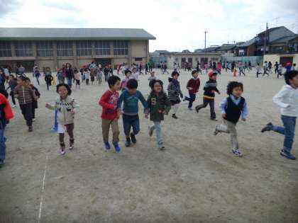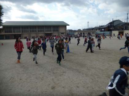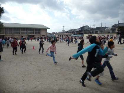 今日は6年生が校外学習で留守ですが,1〜5年生のみんなは頑張って走っています。かもがわマラソンへの意気込みを感じます。