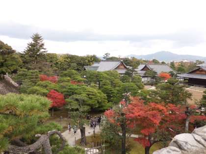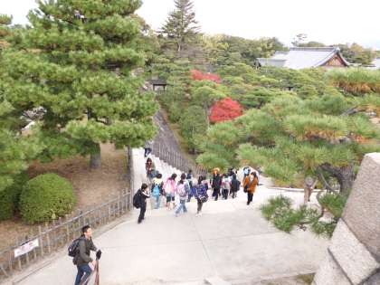 6年生の校外学習,世界遺産を訪ねて,まずは徳川幕府における京都の拠点となった二条城へいきました。秋の紅葉が美しい庭園を満喫。中では写真が撮れませんので,様子を想像してください。絢爛豪華な建築と障壁画は目をみはります。