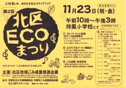 先日も紹介しましたが,11月23日(金)勤労感謝の日,待鳳小学校で北区ECOまつりが行われます。ECOについて考えるよい機会となります。PTAも輪投げとあてものの模擬店を出す予定です。誘い合わせて参加してね。