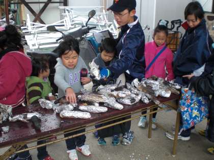 焼きたての焼いもを一人ずつもらって,今日の「大縄&焼いも大会」は終了です。PTA・おやじの会のみなさん,お世話になりました。ありがとうございました。