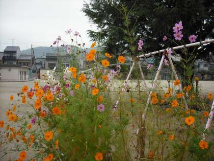 学校では暴風によって物が飛ばないように危険をなものは校舎内にしまいます。ただ,今満開のコスモスや藤袴が倒れてしまわないか心配です。