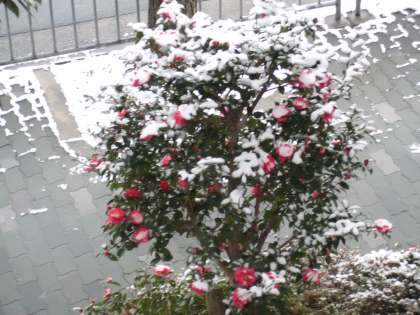 サザンカの花も雪をかぶり寒そうです。
