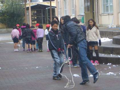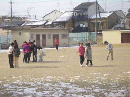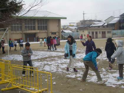 運動場の雪もずいぶん解けてきました。中間休み,雪がちらついていますが,子どもたちは元気に遊んでいます。