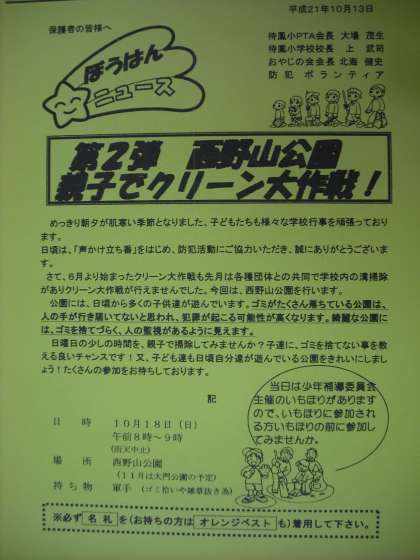 10月18日(日)午前8時〜9時に,おやじの会・PTA防犯ボランティアの共催で西野山児童公園で「親子でクリーン大作戦!」が行われます。今年は6月から始まっているクリーン大作戦,参加してみませんか。