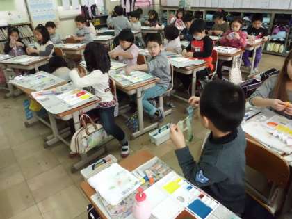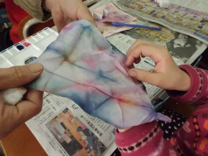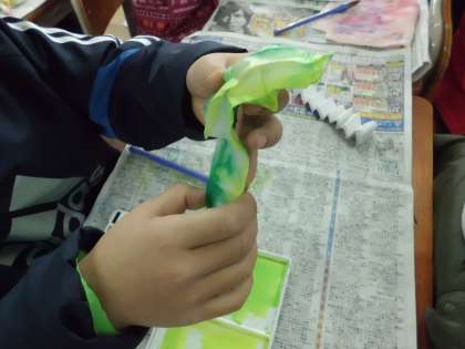絵の具を使って,自分だけの色紙を作っています。さて,何に変身するのでしょう。