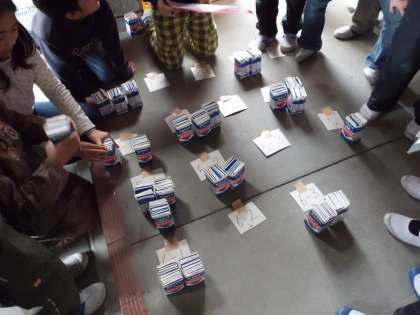 給食週間中,給食委員会が牛乳パックつめ競争をしています。牛乳パックをどれだけ多くつめるのかを競うのではなく,どれだけていねいにつめることができるかの競争です。さて,優勝するのはどの学級でしょう。