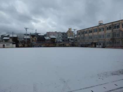 気温は0度,雪のちらつく寒い朝となりました。久しぶりに,運動場が真っ白になっています。