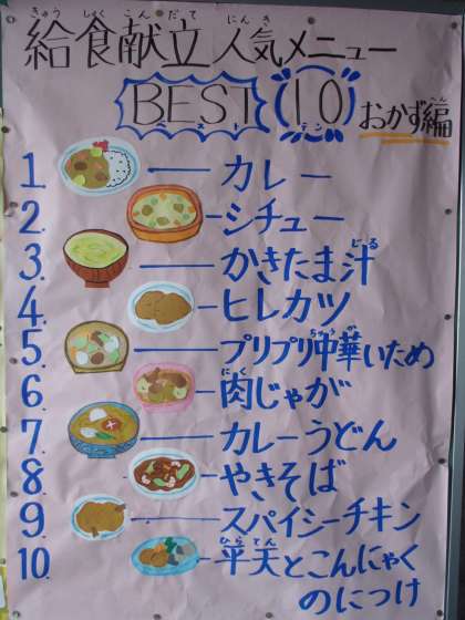 給食週間最終日,給食人気メニューのアンケート結果が発表されました。おかず編,パン編,デザート編の3部門です。おかずでは例年と一緒,やはりカレーが一番人気です。ルーから手作りのカレーはおいしいのでしょうね。