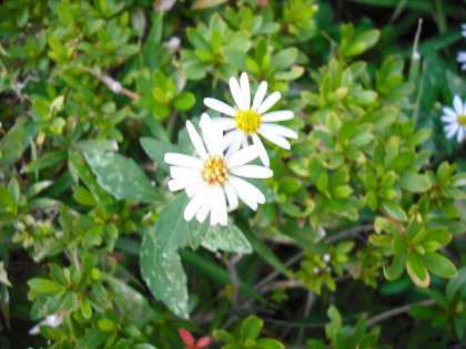 日当たりの良い山野に普通に見られる多年草です。舌状花の色の変化など,たくさんの変種があります。ツツジの植込みから出てきています。