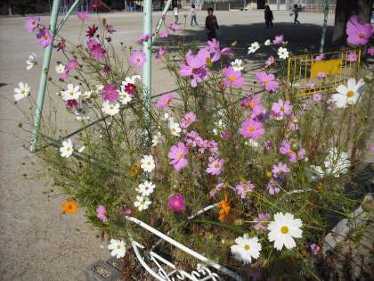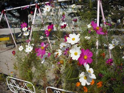 夏休みから咲き始めたキバナコスモスが終わりに近づき,今はオオハルシャギクのコスモスがたくさん咲いています。秋真っ盛りですね。
