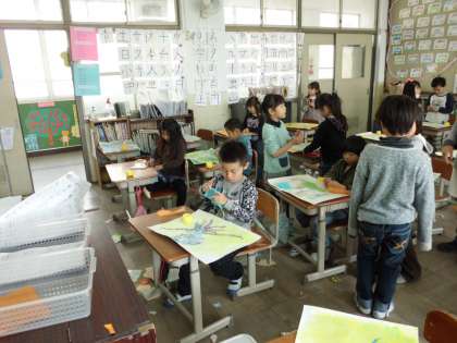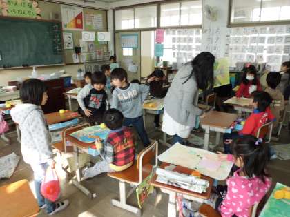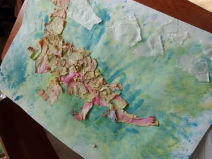 切ったり,ちぎったりしてできた紙をいろいろ試しながら画用紙の上で並べたり,組み合わせたりしています。