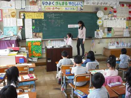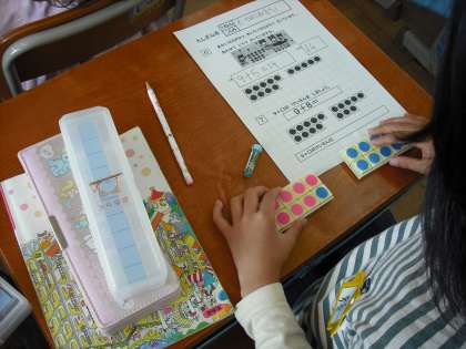 1年生のくりあがりのあるたし算の学習です。1年生でも自力解決の場,集団解決の場を設定して,学習を進めています。ブロックを使ったり,数字を分解したりして自力解決をしています。表現活動を多く取り入れた学習を進めています。