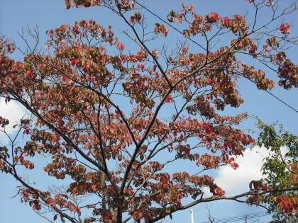 青空に花水木の赤い葉が映えています。