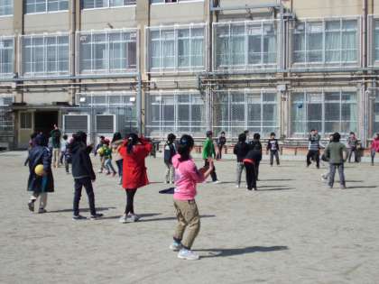 午後1時の気温は13度近くまで上がっています。運動場には暖かさにつられて,いっぱいの子どもたちが遊んでいます。