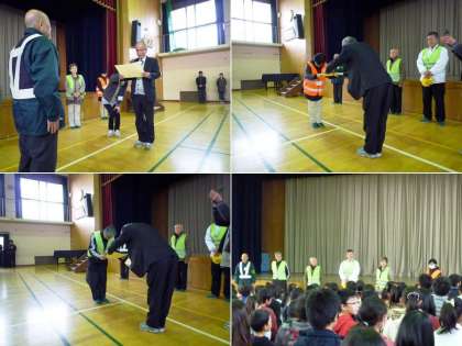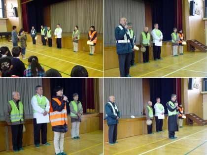 今日,今年度最後の朝会がありました。今日の朝会は,毎日私たちの登下校を見守ってくださっている地域の方々への「感謝の集い」でした。長年,この見守り活動をしてくださっている川嶋さん,待鳳見守り隊,PTA防犯ボランティアの皆さんに,校長先生から感謝状をお渡ししました。また,児童会の代表の人からもお礼の言葉と感謝状をおくりました。皆さんからは「みんな,しっかり成長しています。毎朝,元気に学校へ通ってください」「おはようという声が返ってくるとうれしいです」というお話がありました。